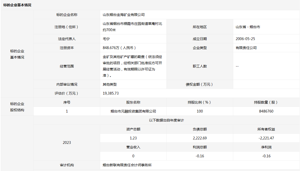 山東煙臺(tái)金海礦業(yè)有限公司100%國(guó)有股權(quán)