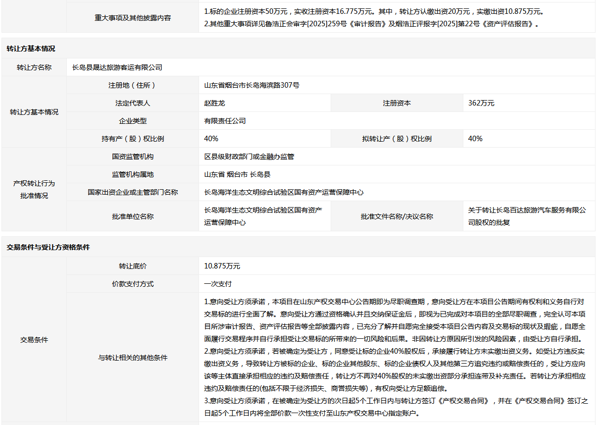 長島百達(dá)旅游汽車服務(wù)有限公司40%國有股權(quán)