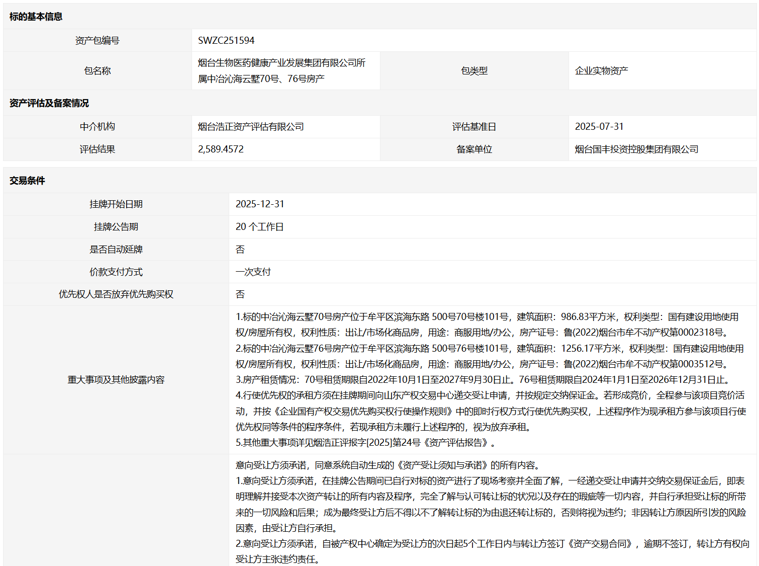 煙臺(tái)生物醫(yī)藥健康產(chǎn)業(yè)發(fā)展集團(tuán)有限公司所屬中冶沁海云墅70號(hào)、76號(hào)房產(chǎn)