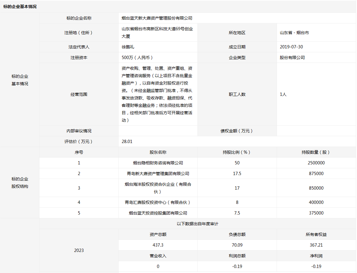 煙臺藍天新大唐資產管理股份有限公司7.5%股權(37.5萬股股份)