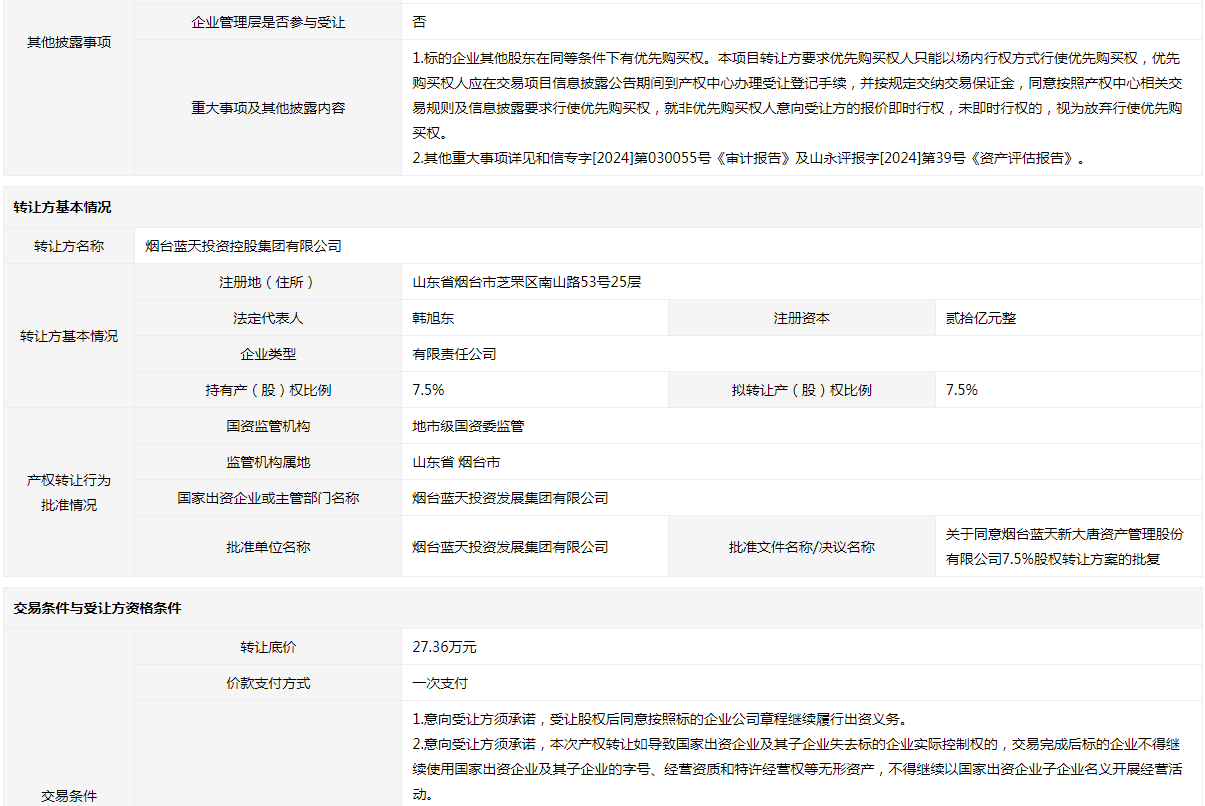 - 轉(zhuǎn)讓方:煙臺(tái)藍(lán)天投資控股集團(tuán)有限公司