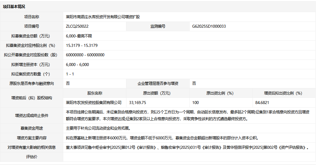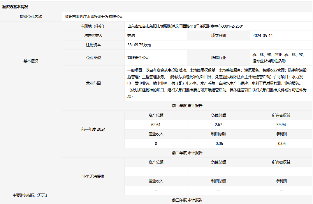 萊陽市南泗莊水庫投資開發(fā)有限公司增資擴(kuò)股