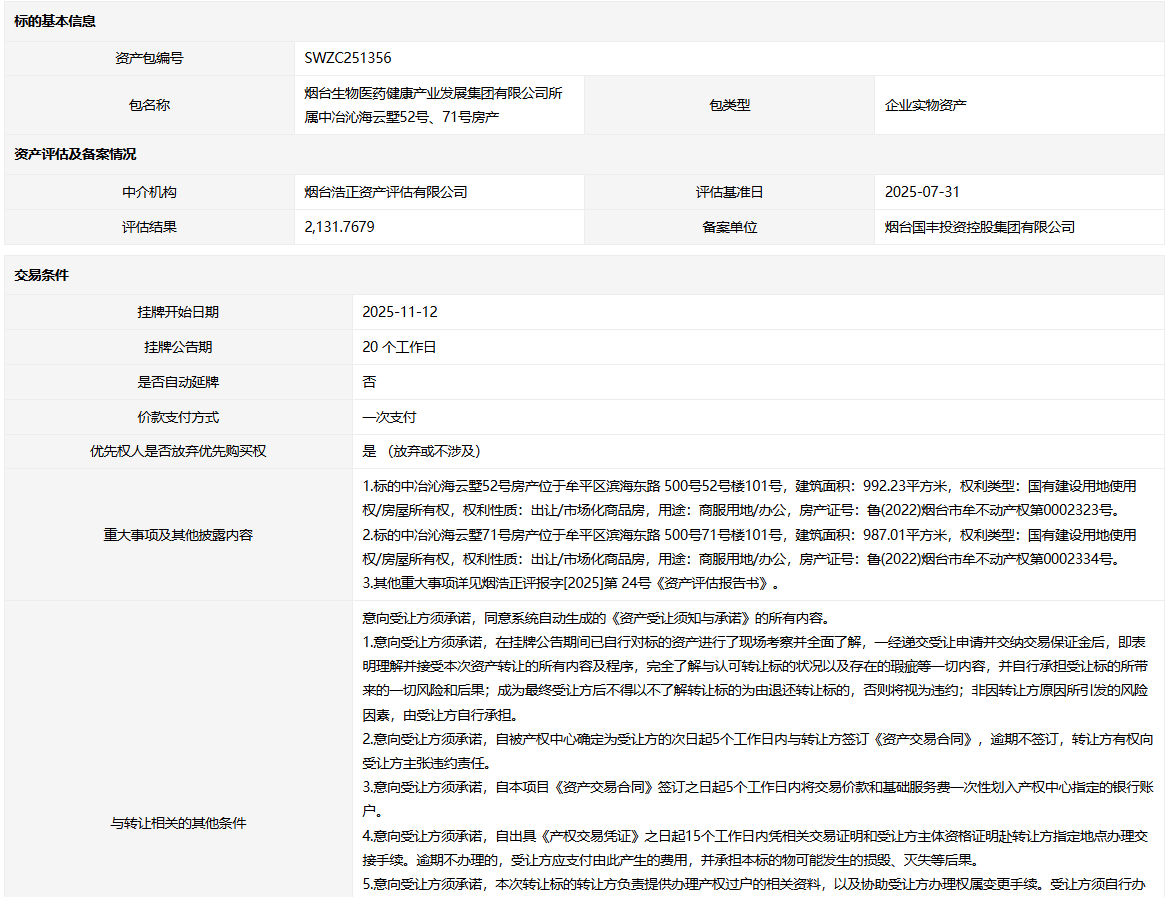 - 轉(zhuǎn)讓方:煙臺生物醫(yī)藥健康產(chǎn)業(yè)發(fā)展集團(tuán)有限公司